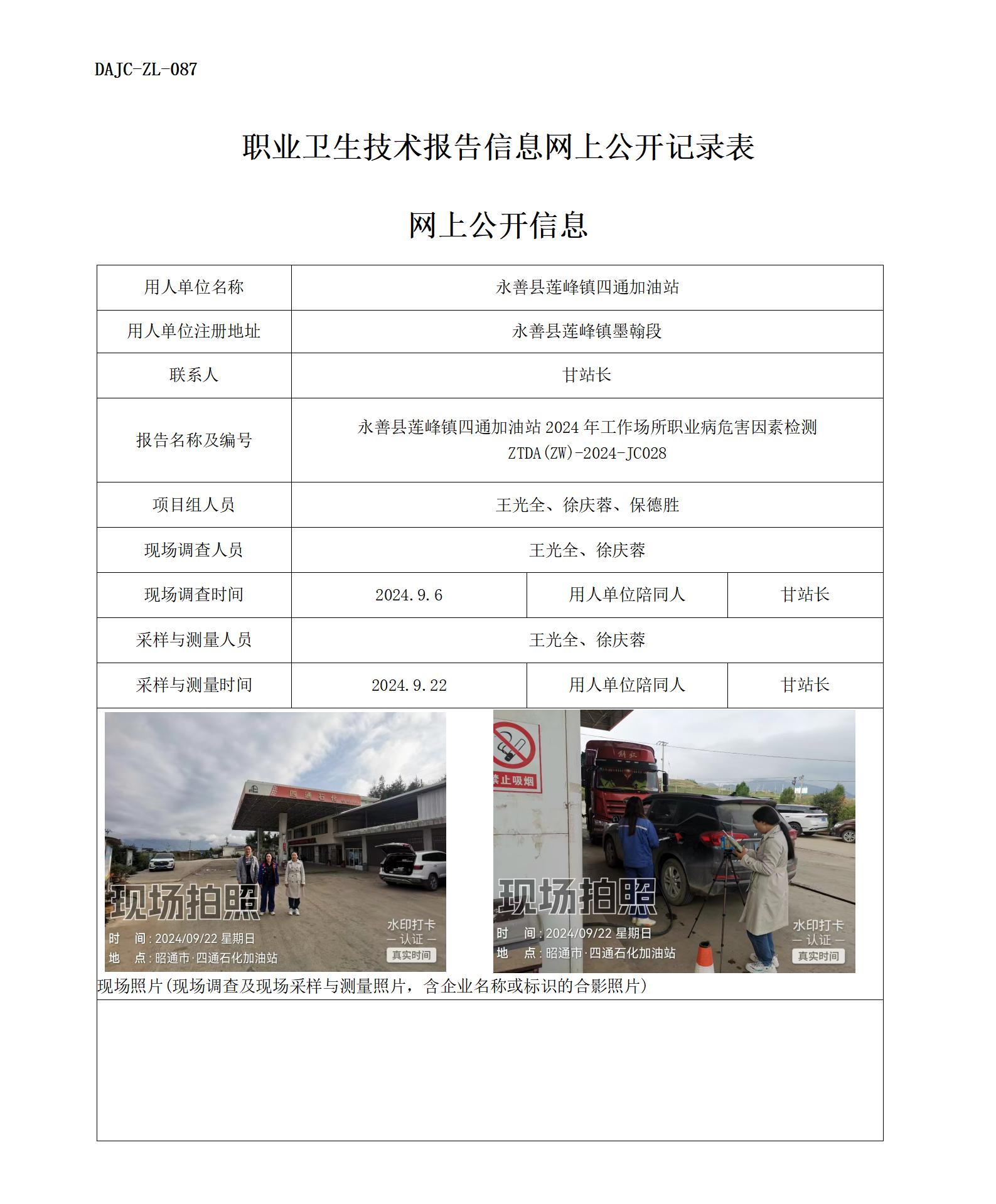 永善縣蓮峰鎮四通加油站2024年工作場所職業病危害因素檢測 ZTDA(ZW)-2024-JC028